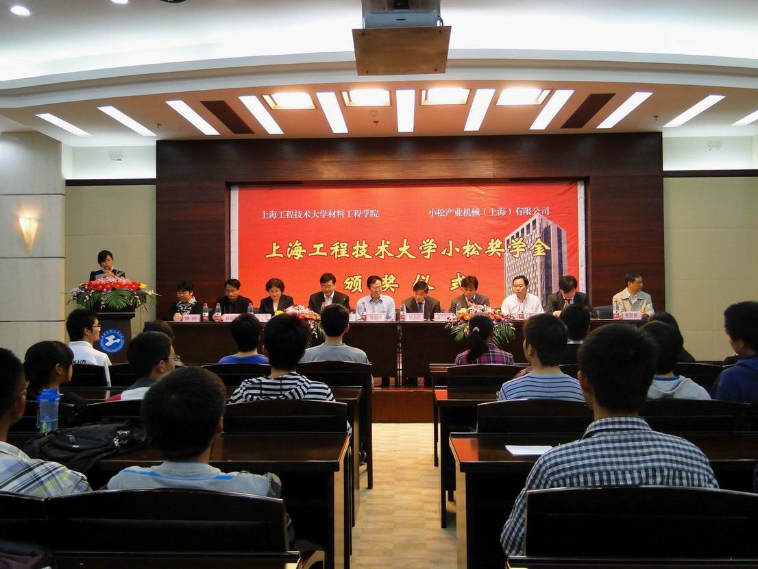 114下午15:00,材料工程学院在我校图文信息中心第三报告厅举行上海工程技术大学小松奖学金揭牌及颁奖仪式。小松产业机械上海有限公司副总经理徐大任,副总经理金子达也,销售代表强永佳,校学生处副处长黄文洁,材料工程学院院长于治水,党总支书记徐国祥,材料工程学院党总支副书记薛玲与学生代表参加了此次仪式。本次仪式由材料工程学院分团委书记刘艳红老师主持。