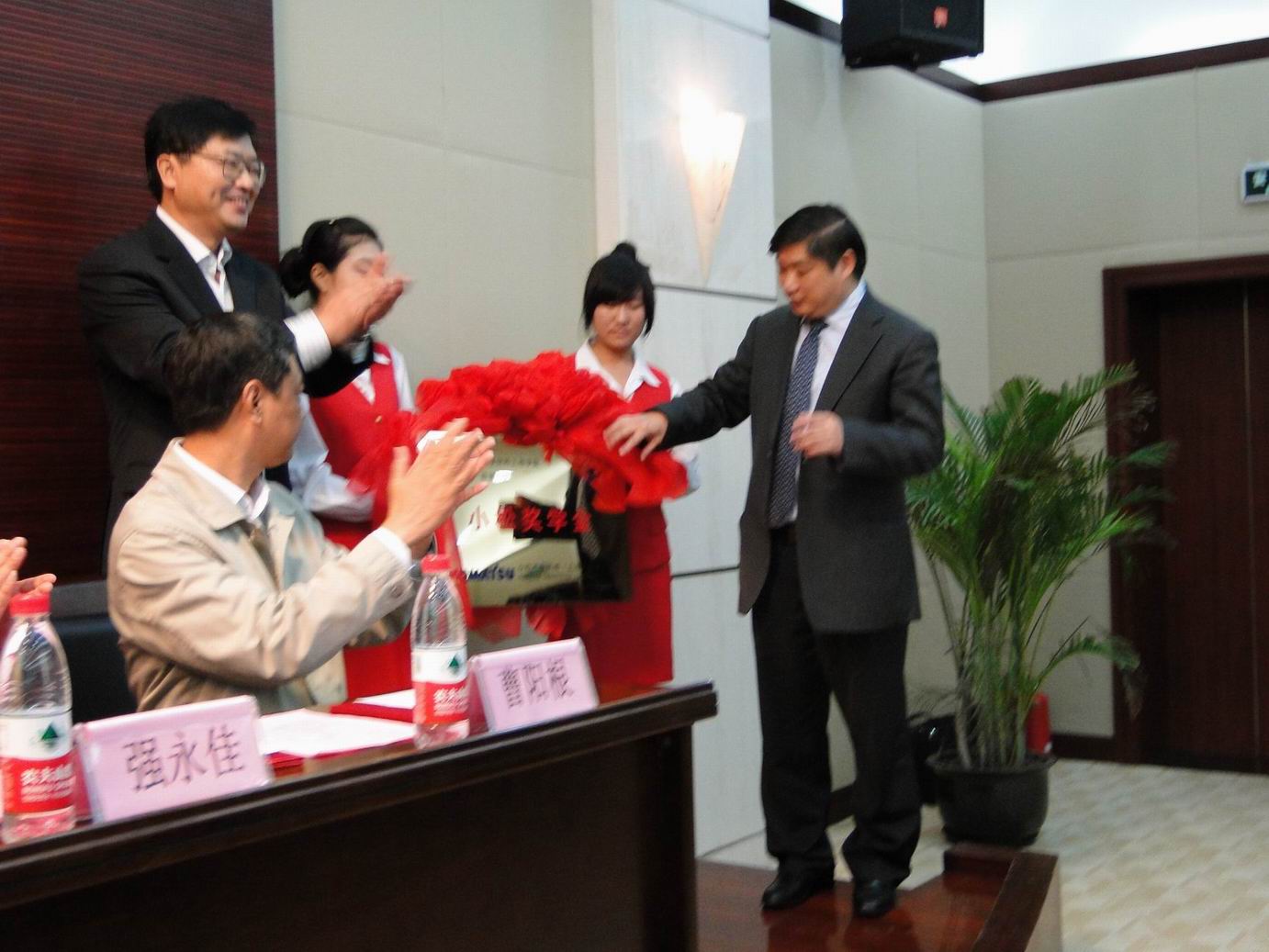 会上,徐大任副经理和于治水院长先为小松奖学金揭牌,材料工程学院党总支副书记薛玲老师介绍了奖学金的评定标准,徐大任副经理宣读了2011 年度上海工程技术大学小松奖学金获奖学生名单,并为获奖学生颁发了荣誉证书。马青山同学代表获奖同学发表感言,表达了自己作为受助学子对小松集团的感谢,以及不懈进取的决心。接着,徐大任副经理明确表示在上海工程技术大学设立奖学金的目的就是要鼓励学生努力学习,希望获奖学生学有所成。最后,于治水院长提出“自立自强完成学业,回报社会”的要求。