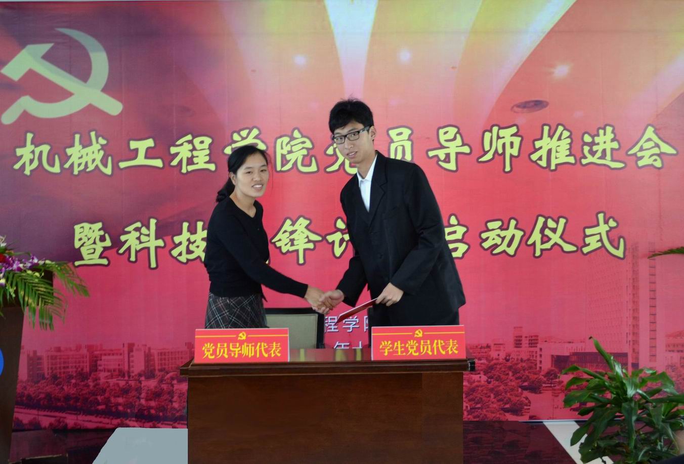 首先,机械工程学院党总支书记刘牧众介绍学院“党员导师计划”的实施内容、方式、方法以及考评机制,并且宣读了首批党员导师结对名单;随后程武山院长和党总支书记刘牧众为首批受聘的十名党员导师颁发聘书;接着,程武山院长所作为机械工程学院的科研带头人向学院首批受聘的党员导师和结对的学生党员提出要求,希望师生们以学院蓬勃开展的各类科研活动以及大学生科技创新活动为基础,发扬艰苦奋斗、只争朝夕的精神,以实际行动践行党员导师计划。随后,党员导师代表张春燕老师与学生党员杨振同学进行了结对师生签约、互赠礼物并且分别结合自己的工作学习实际体会进行了发言。
