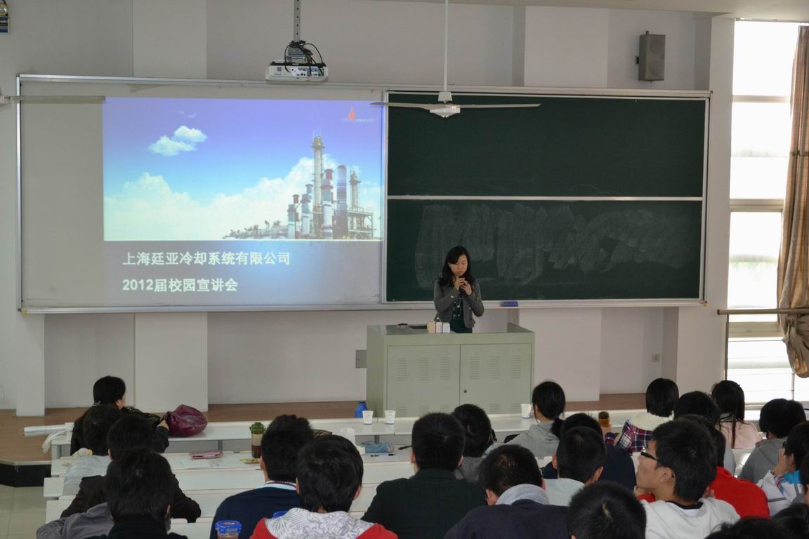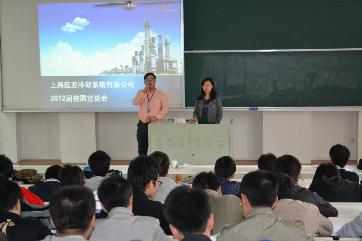 10月25日下午,上海廷亚冷却系统有限公司行政人事部吴经理等来到机械工程学院召开宣讲会。此次宣讲会主要招聘技术工程师、商务工程师等共计30名。机械工程学院2012届所有专业毕业生参加了招聘会,机械工程学院就业辅导员赵晔��老师主持了宣讲会。宣讲会持续了近一个小时,随后一百多名同学参加了首轮笔试。