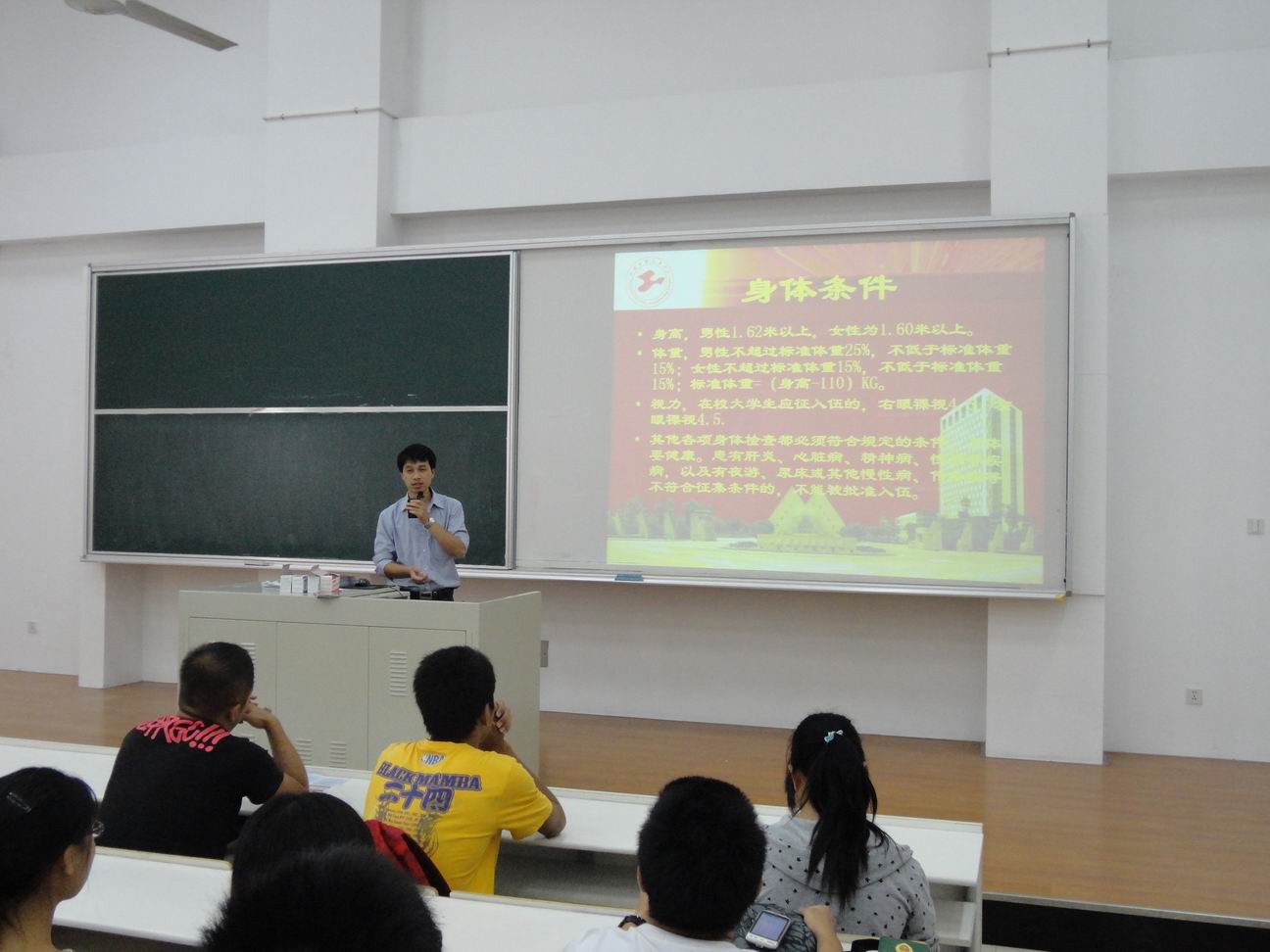 虞蓉老师首先鼓励了志愿当兵的同学,肯定了他们的志愿服务及爱国精神,并对同学们提出了服务兵的要求,需要他们具备不怕苦不怕累、勇于付出的精神。虞老师还传达了学校关于今年征兵工作相关文件精神,并详细介绍了关于大学生应征入伍的各项政策,为大家说明了报名的时间、征兵办法以及征兵工作的时间安排,重点为同学们宣传了征兵的优抚政策和保障,鼓励同学们鼓励大家踊跃报名,报效祖国。