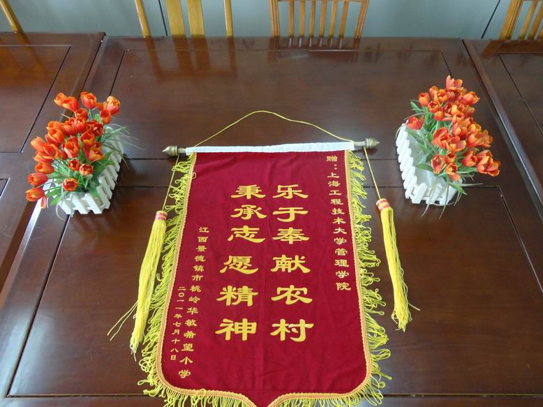 1010上午,管理学院收到了来自江西省景德镇市桃岭小学的深情感谢,桃岭小学的全体师生将一面绣着“秉承志愿精神,乐于奉献农村”的锦旗通过学校团委转交到了管理学院的手中,对管理学院在今年暑期对桃岭小学的帮扶活动表示衷心的感谢。