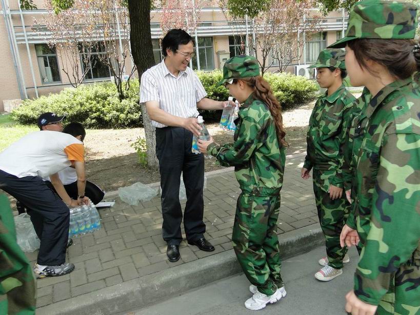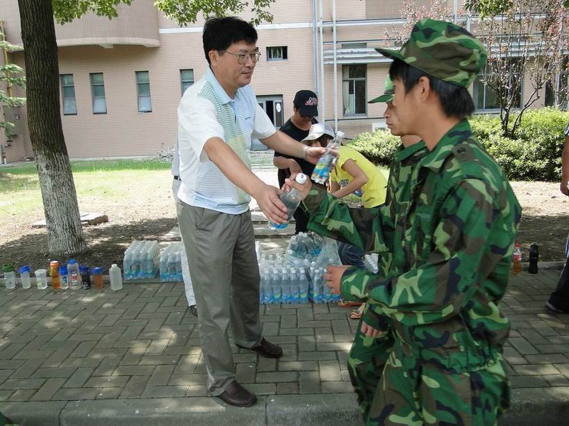 徐国祥老师和于治水老师首先和教官交流了解了五营近几天的军训工作进展状况,并对教官的辛勤训练表示感谢。之后,徐国祥老师和于治水老师还亲自给学生发放盐汽水,让同学们倍受感动。最后,他们还驻足观看了五营训练英姿,并对他们整齐的步伐、嘹亮的口号予以高度赞扬。