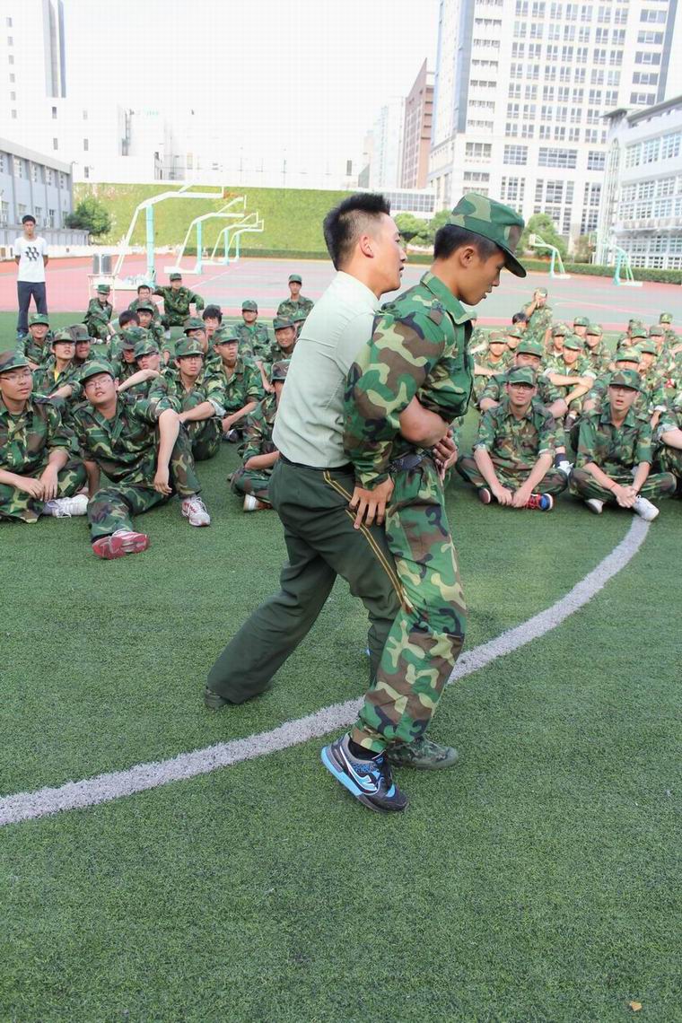 男生连中有同学提出想和教官来一番“较量”,于是大家从教官和同学中各选出一名代表,由另一位教官担任裁判,“战斗”开始了。只见教官与同学“抱”成一团,双方势均力敌。而连队中传出了阵阵掌声,为两位加油打气。这更加激起了两位战士的斗志。他们一招一式都格外有力,气势不凡。最终教官还是以微弱的优势将学生“击倒”,操场上再次爆发出了雷鸣般的欢呼声。