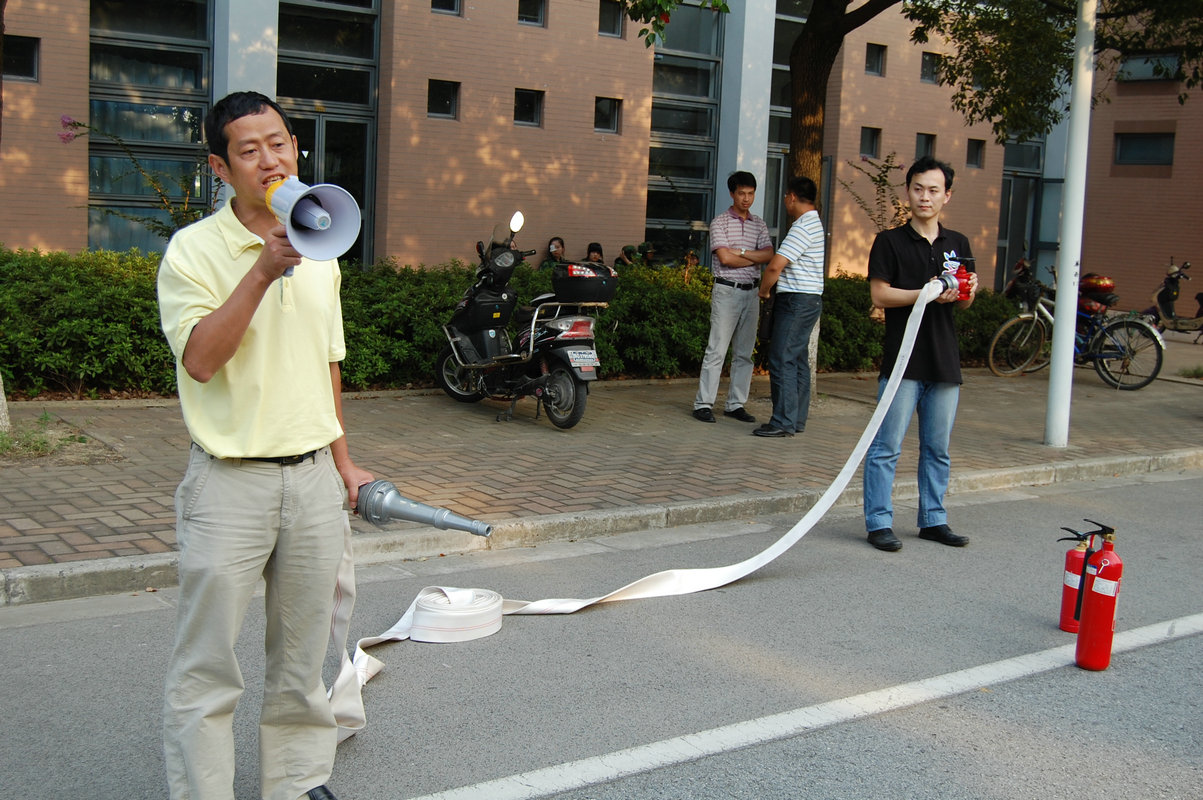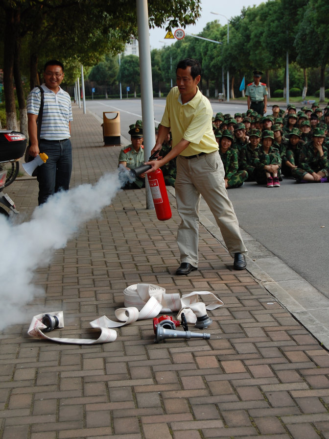 王振钧副处长还以现场一颗大树的根部为火源,为新生们当场演示了各种灭火器的使用方法。最后,保卫处副处长王振钧还用上海商学院四名女生因缺乏消防知识和自我保护意识死亡的事例警戒新生们要以此为戒。