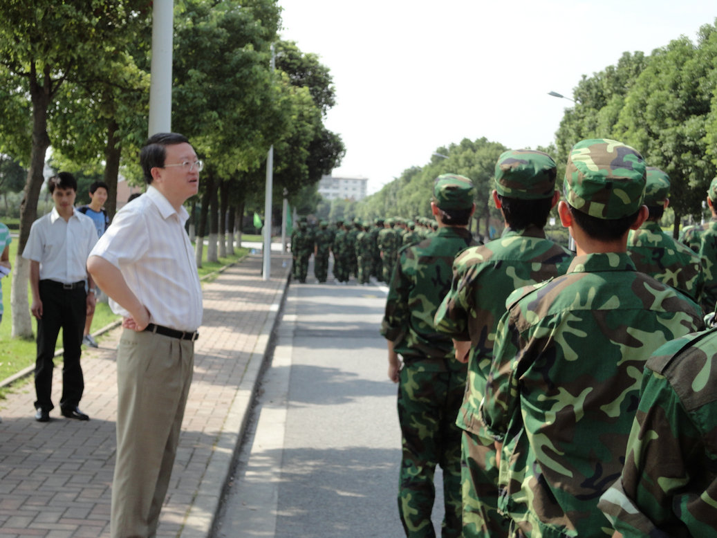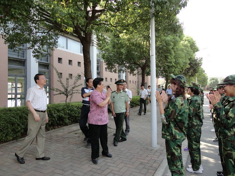 9月6日上午九点,汪泓校长、孙培雷副校长、程维明副校长、军训旅旅长冯相海中校、学生处处长王明复老师一行来到三营训练场地看望和慰问正在烈日下军训的三营承训教官和军训学生。