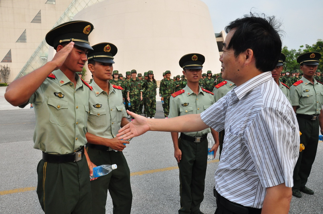 自八月末开始的入学军事训练到现在,新生们已经在骄阳下体验了将近一周的军队生活。同学们在训练场上不仅锻炼了体格,也锤炼了自己的意志力、培养了吃苦耐劳的精神和对纪律的重视。今天下午三时,院长马新宇,院党组织书记许传宏与党总支部书记何志琴,院办主任龚瑶红,教师刘江、刘蔚,以及全体班导师、全体辅导员老师来到位于校图书馆西面的训练场观摩七营同学的训练,并对同学们与各排的教官们表达了亲切的慰问。