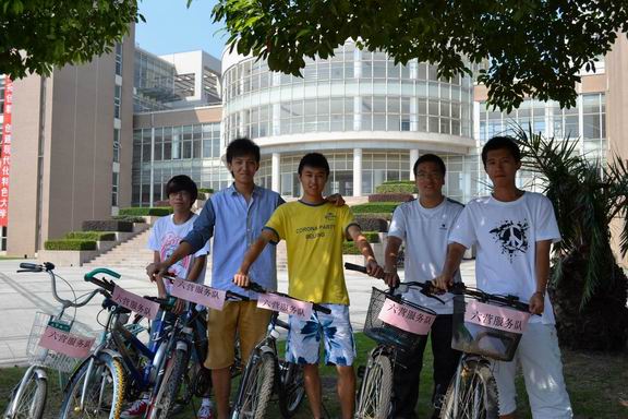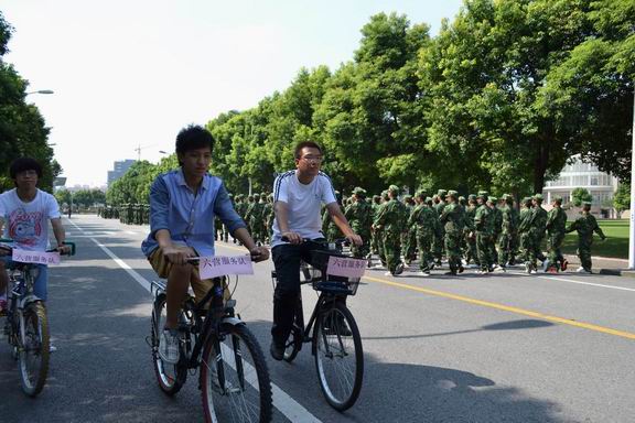 9月4日,教学楼B楼门前停着一排意义非凡的自行车队,它们是由汽车工程学院团学联同学自发组建的一支“六营服务队”。
