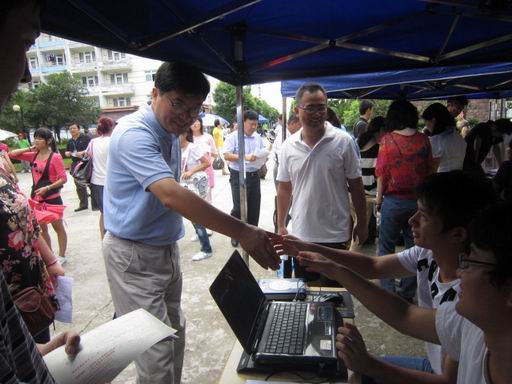 上午9:30,材料工程学院院长于治水老师、党总支副书记薛玲老师在学院辅导员吴挺老师的陪同下亲临迎新现场,视察此次迎新工作并给予现场指导。于治水老师亲切慰问了各位迎新志愿者,并对他们放弃暑假休息的时间投入到迎新工作中的奉献精神给予了高度的赞扬,同时,于治水老师针对往年迎新工作中遇到的问题,包括新生报到、体检、绿色通道等方面的问题,叮嘱各位志愿者一定要严格按照流程,认真做好每个环节。