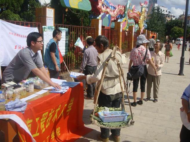 化学化工学院志愿者服务队利用学科专业环保知识,结合当地的环境问题,通过现场科学实验、问卷调研、科普宣讲等形式开展活动,其内容包括“自来水净化流程演示及水安全知识讲解”;“生活污水处理方法演示”;“一次性餐具对环境的危害宣讲”;“低碳生活和环保意识调研”等一系列有关居民健康低碳生活的主题。当地居民对各类活动产生了浓厚的兴趣,纷纷参与其中,询问他们生活中遇到的环境的问题,这些都得到了志愿者一一耐心的解答。学院分团委还精心制作了低碳生活的宣传册,将其派发给当地居民,使他们随时能够翻阅与自己生活息息相关的健康知识。对于参与现场问答和调研的群众,志愿者们购买了可循环利用的不锈钢餐具赠送给他们,呼吁他们以实际行动参与到环保的行列中去,为地球母亲尽自己的一份力。