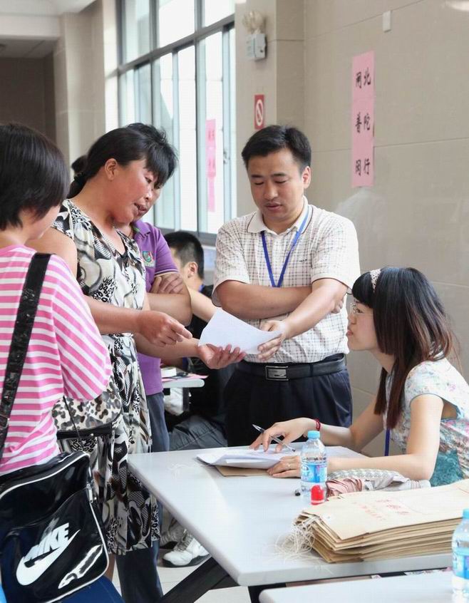 校园报到现场洋溢着欢乐新鲜的气息,彩旗横幅装点得校园青春勃发;位于师生活动中心二楼的报到接待点热闹非凡,新生和家长们按照报到流程完成着各项手续,接待工作有条不紊;众多佩戴胸牌的志愿者热情地负责着引导、接待、服务工作,学生科、教务科、财务科等也设摊置点,进行咨询指导服务……
