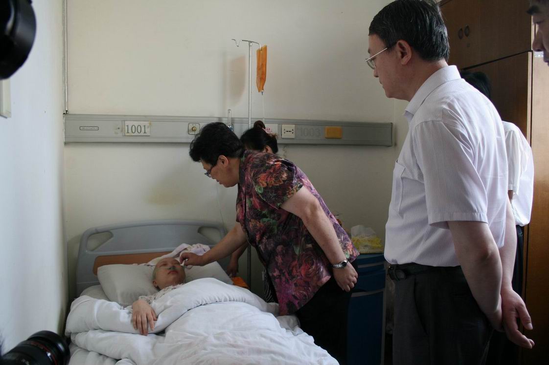 在病榻前,汪校长亲切地呼唤丹丹的名字,听说丹丹因脑部肿瘤压迫导致左眼失明,如今耳鸣头晕、下半身麻木,校长还给她按摩,嘱咐她要坚强地面对疾病,勇敢同病魔作斗争,早日康复!汪校长还与丹丹的家属亲切交谈,详细了解丹丹同学的病情及目前的治疗情况,不时地与有关医疗机构联系,转达了学校对丹丹病情的关切及家属对病人的感情。她希望有关方面能够会同各科室专家尽力治疗丹丹同学!