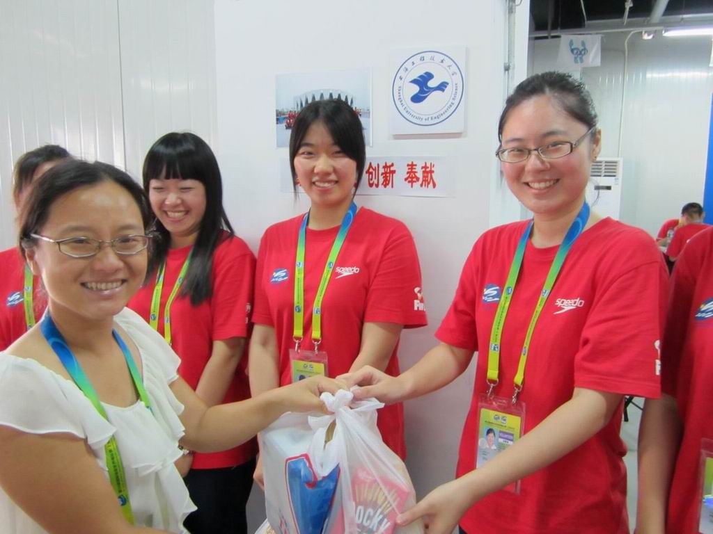 7月28日下午14:30,化学化工学院党总支副书记熊筱晶老师、分团委书记石海雄老师和辅导员熊伟老师来到了上海东方体育中心,看望慰问正在为“上海世界游泳锦标赛”辛勤奉献的学院世游赛园区志愿者。