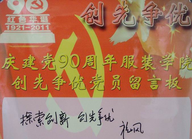 成果展示内容为服装学院党总支、2个校级学习型党支部、6个学院学习型支部、5名一人一事一例的优秀党员的风采,通过图文并茂的方式反映了服装学院党总支开展创先争优活动以来的工作情况、活动特色和奋发向上的精神面貌以及取得的成绩,为积极筹划下一阶段工作奠定基础;反映了服装学院结合庆祝建党 90周年,进一步加强和改进新形势下党建工作,深化开展“创先争优”活动,真正发挥“一名党员就是一面旗帜,一名党员就是一根标杆,一个支部就是一个堡垒”的先锋模范作用,为庆建党90周年献礼。最后,校党委副书记褚劲风在展览留言板上题词:“探索创新,创先争优”。