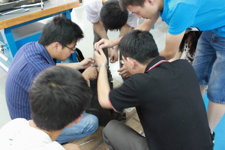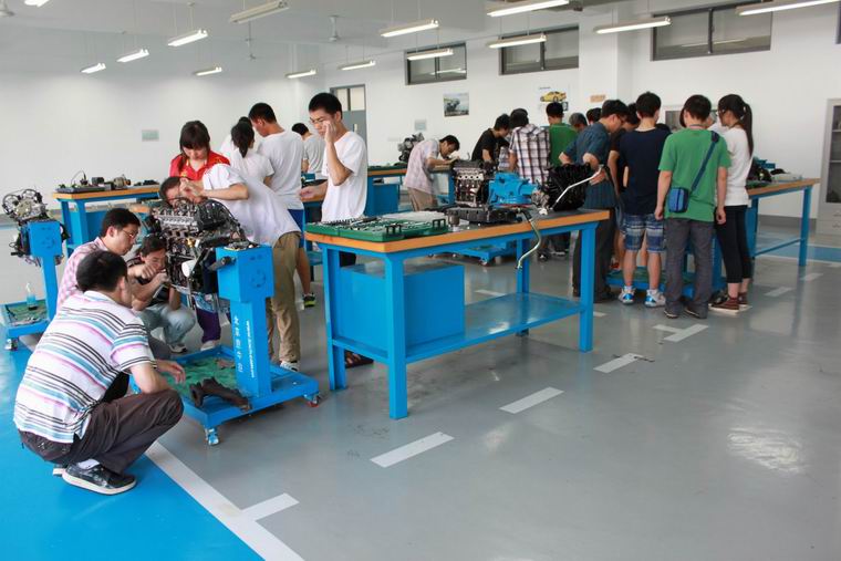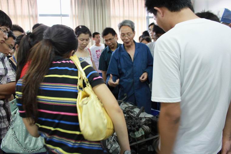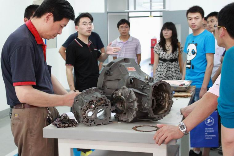 6月28日下午13:30,暑期学校学员们来到汽车工程实训中心5号楼,对汽车发动机和变速器进行拆装实习,这是暑期学校教育计划的一个重要实践课程。汽车发动机与变速器的拆装,对来自全国各地的研究生精英们而言,可谓是轻车熟路,为使学员们了解更多型号的发动机和变速器,暑期学校利用实训中心丰富的教学资源,组织学员们进行拆装实习。学员们分为8个组,每组7人,其中4个组参与发动机拆装,另外4个组参与变速器拆装,在专业老师的示范下,学员们首先学习一些专用工具的使用方法,然后在老师的指导下,一步一步进行规范化拆装。如以同步器5档部分为例,学员们对5档部分进行拆装,了解其运动关系和原理,同样通过拆装1、2、3、4档和倒档,加深了解变速器互锁和自锁的机构原理、差速器和主减速器的原理和相互关系。