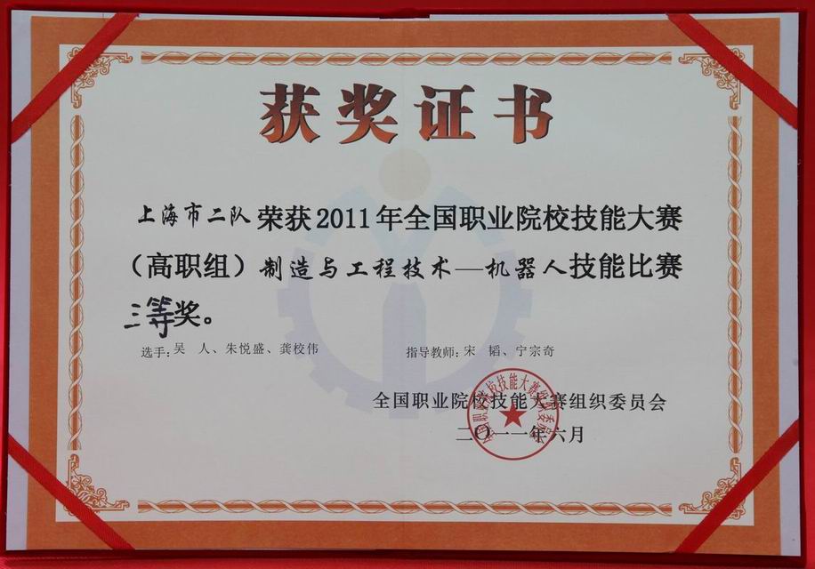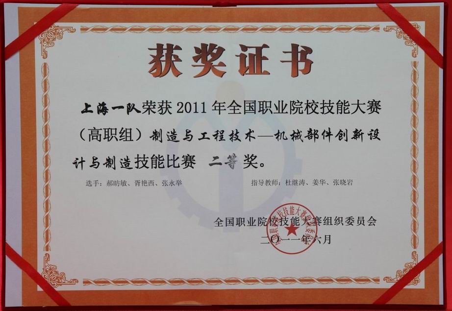高职学院、高级技校在参加高职组“机械部件创新设计与制造”、“机器人技术应用”和中职组“数控机床调试与维修”三个竞赛项目上,分别获得高职组“机械部件创新设计与制造”二等奖,中职组“数控机床调试与维修”二等奖和高职组“机器人技术应用”三等奖,全国职业院校学生技能作品----传动机构装置展示一等奖,为上海市赢得了荣誉,受到了市教委领导的好评。