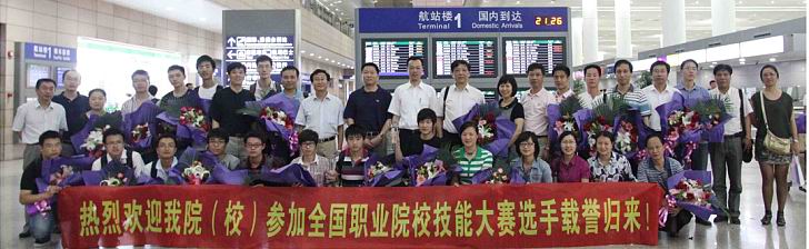 6月27日晚8时许,高职学院、高级技校赴天津参加2011年全国职业院校技能大赛的选手手捧奖杯和证书载誉而归,总领队刘启中院长,领队许锦彪副院长同机归来,受到高职学院党委书记柳如荣,副书记李军,副院长胡宁和田盈耕及师生员工们的热烈欢迎!