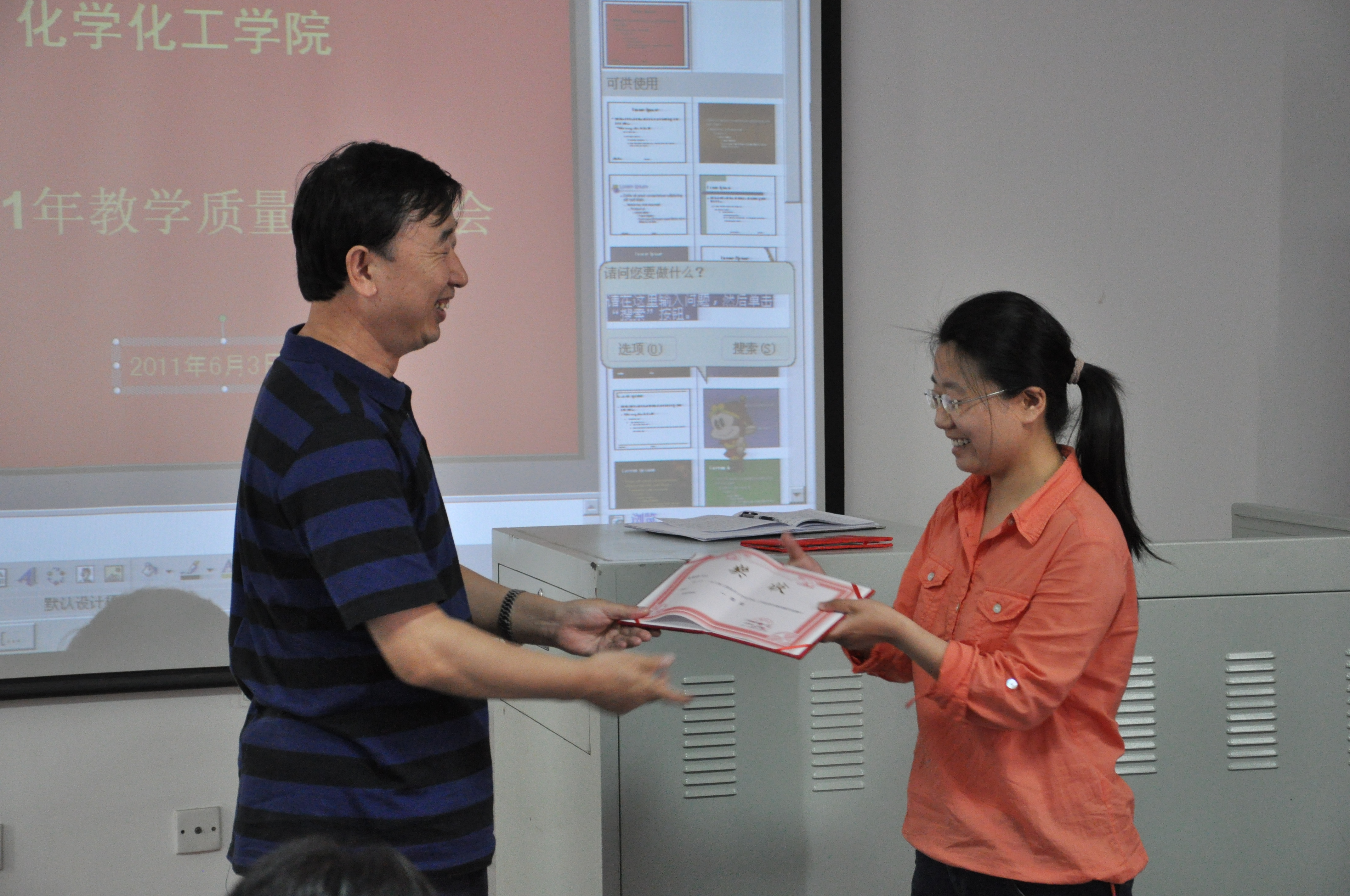 最后,徐菁利院长为我院青年教师教学竞赛获奖者颁奖并作总结讲话。相信,乘着“教学质量月”的东风,化学化工学院的教学质量将迈上一个新的台阶。