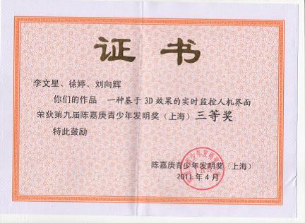 5月20日下午,上海市第九届陈嘉庚青少年发明奖颁奖典礼在上海科学会堂地热厅隆重举行,参加该次颁奖典礼的嘉宾有陈嘉庚青少年发明奖委员会主席曹家麟、上海市科学技术协会副主席俞涛等领导及上海各大高校科研机构代表参加。在本届发明奖评选中,机械工程学院董林老师指导的李文星同学作品《一种基于3D效果的实时监控人机界面》喜获三等奖、乔浩丹同学作品《一种基于OPC技术的工业生产数据采集系统》获得鼓励奖。