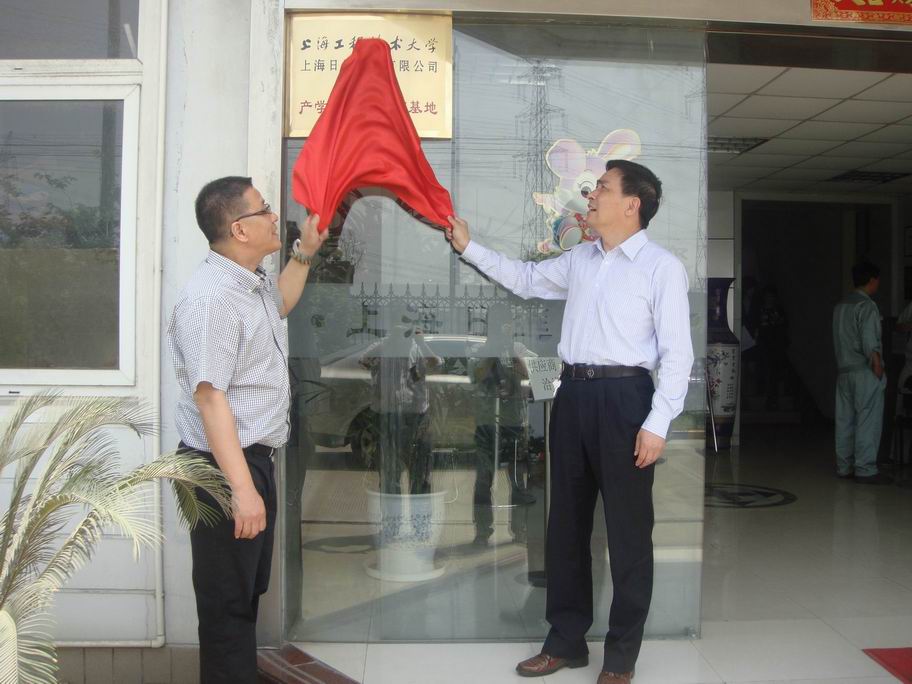 最后,程武山院长和卢建明董事长为“上海工程技术大学-上海日进机床有限公司产学研合作教育基地”揭牌并和大家一起合影留念。