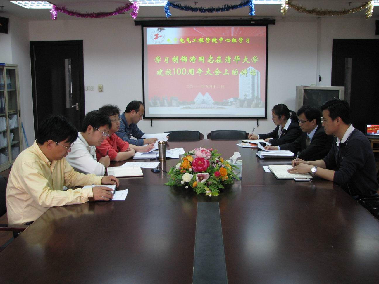 5月12日上午11:00,电子电气工程学院于行政楼912进行院中心组学习,学习胡锦涛在庆祝清华大学建校100周年大会上的讲话精神。会议由院党委书记茅蕾主持,学院全体党政班子成员参加会议。
