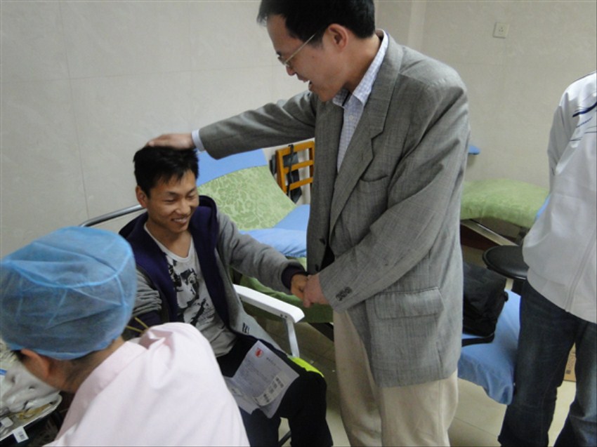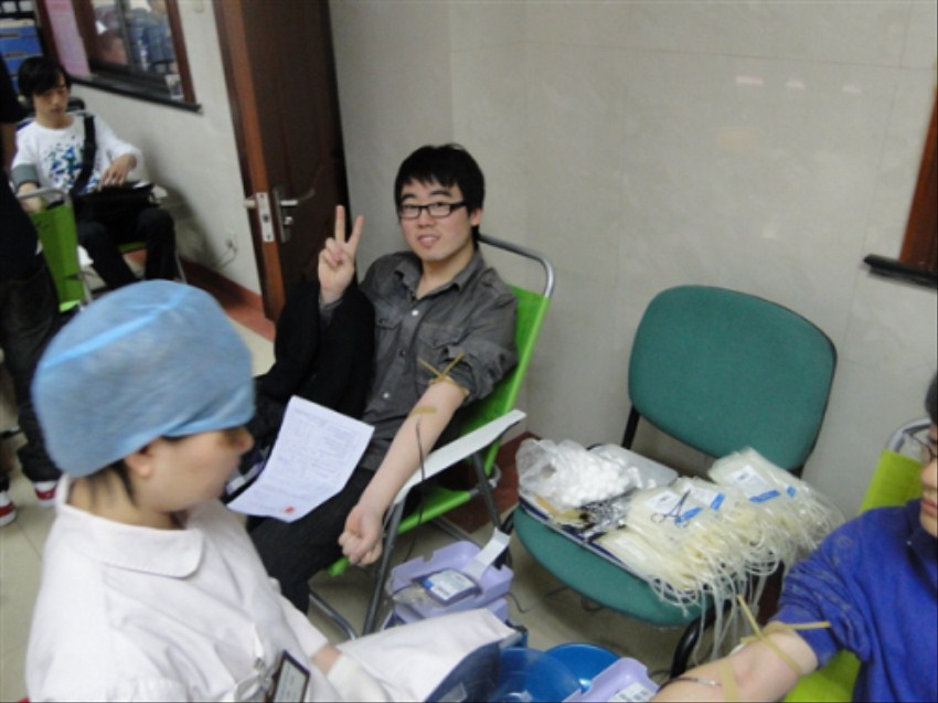 “用爱心为生命加油!”,5月6日上午,材料工程学院百余名同学怀着无比崇高的心情前往松江血站进行无偿献血。材料工程学院党总支书记徐国祥老师亲自前往献血现场慰问献血学生。学院党总支书记徐国祥老师亲切看望了参加献血的同学,询问了大家的身体状况,叮嘱同学们在献血过后要注意休息,补充营养。学院党总支副书记薛玲老师,分团委书记刘艳红老师,09级辅导员江先锋老师以及吴挺老师在现场展开指导及慰问工作。学校医务室做好了充分的准备工作,让每一个同学感受到了学校及学院的关怀之情。