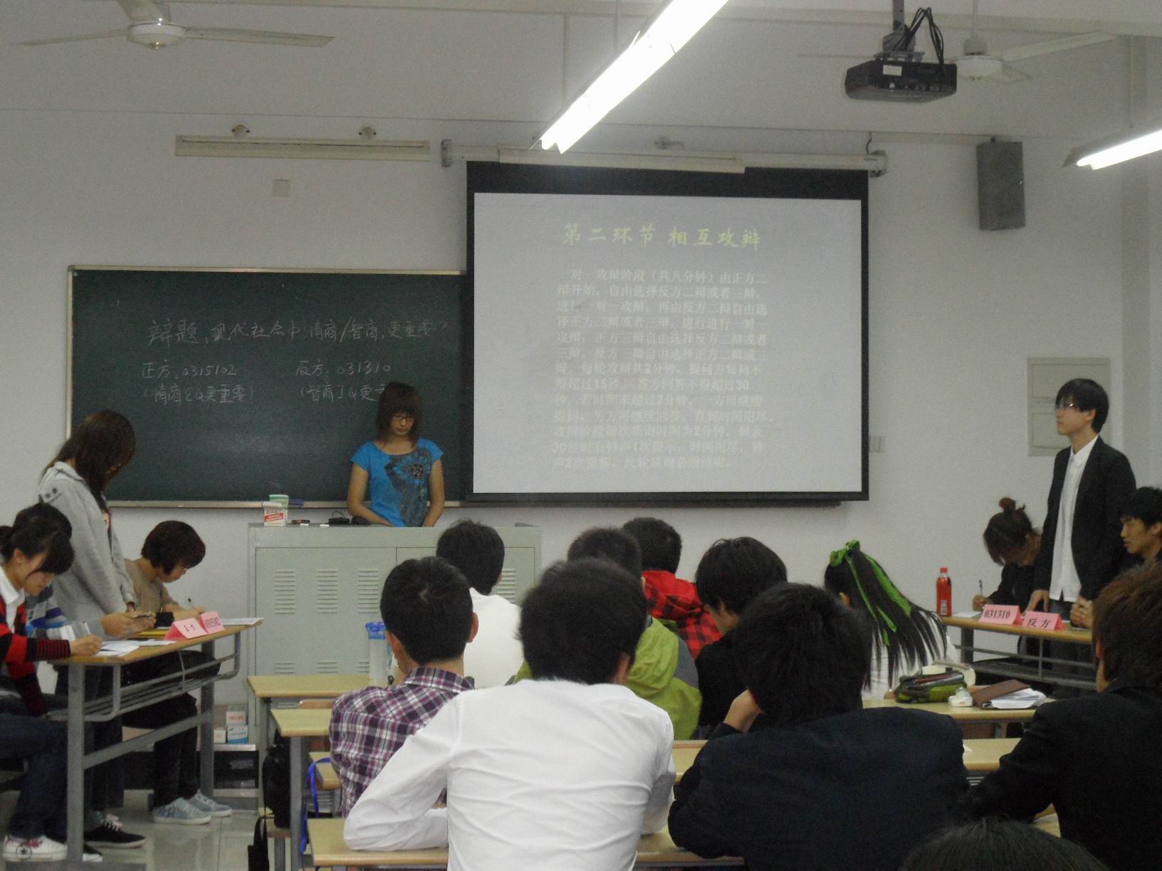 4月27日下午18:30,管理学院第三届“彦博杯”辩论赛复赛在教学楼E207举行。受邀担任本次比赛评委的有管院辩论队主力严俊浩、心协副部长郑剑翔、社团部副部长于游游。本次辩论赛的辩题是“现代社会中,情商和智商谁更重要?”,由正方031510102对决反方031310。