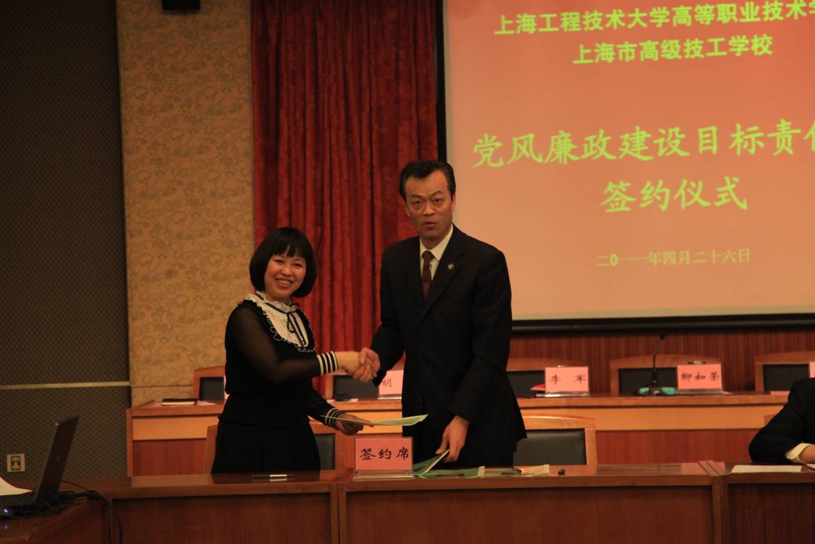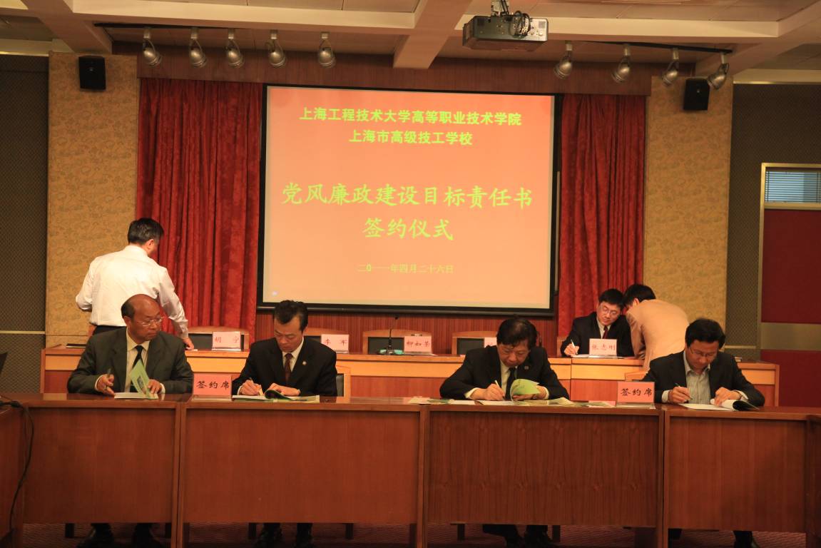 上海工程技术大学高职学院、高级技校于2011年4月26日下午三点在综合楼九楼第二报告厅召开了“2011年党风廉政建设干部大会”,会上党委副书记、纪委书记李军同志传达了俞正声同志在九届市纪委六次全会上的讲话精神并总结了2010年学院(校)党风廉政建设工和部署2011年学校党风廉政建设工作。