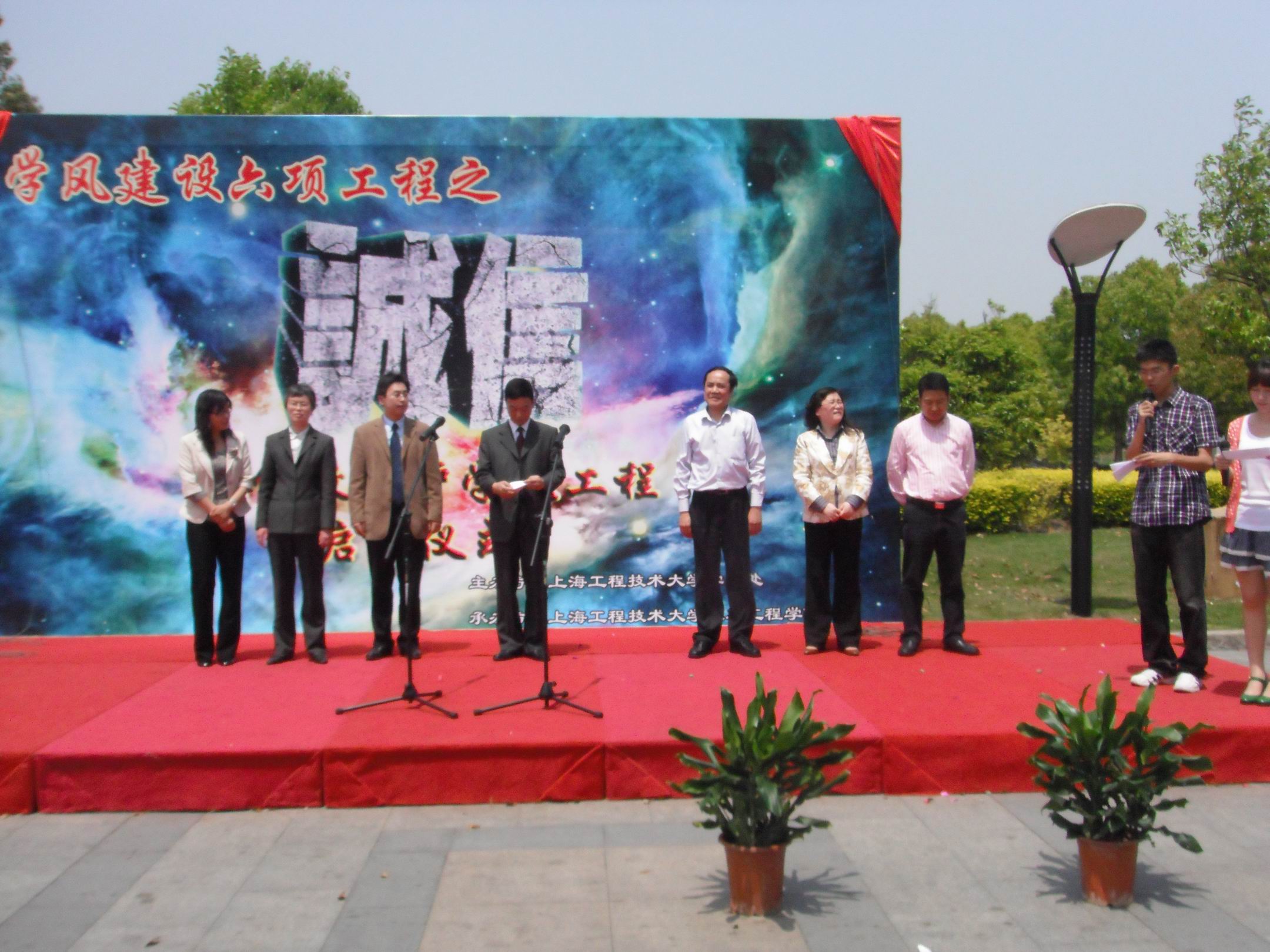 4月26日中午12:10,在大食堂门口,由学生处主办、汽车工程学院承办的上海工程技术大学“学风建设六项工程”启动仪式隆重举行。副校长陈力华,学生处处长王明复、副处长黄文洁、徐阳,汽车工程学院党总支书记周洁、常务副院长王岩松、党总支副书记段海霞及各学院党总支副书记参加了启动仪式。副校长陈力华和学生处处长王明复为活动揭幕。