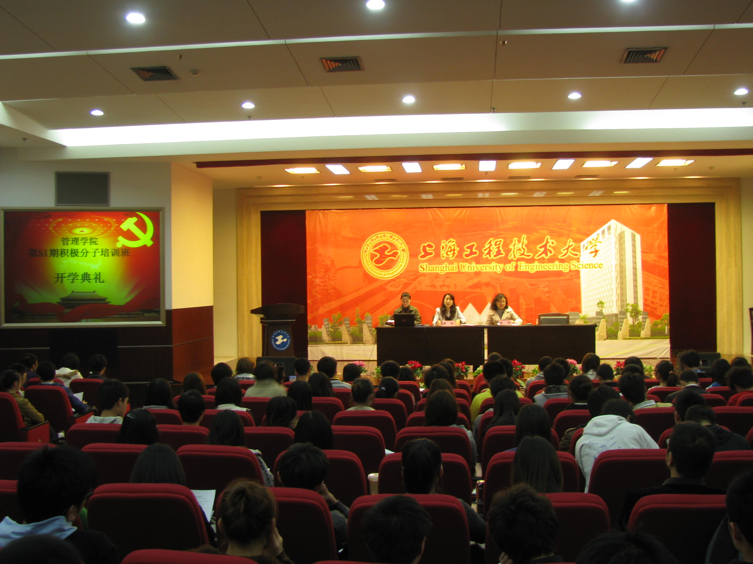 4月22日中午12:30,上海工程技术大学管理学院在图文信息中心第二报告厅举行了第51期入党积极分子培训班开学典礼。此次开学典礼由管理学院组织员丁红娟主持,党委书记吴清老师、副书记虞蓉老师出席,学院全体学员参加了此次开学典礼。