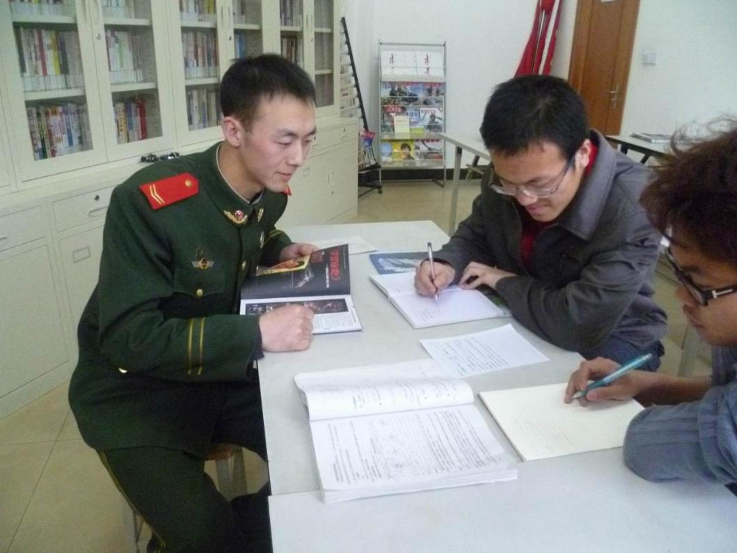 化学化工学院志愿者万体馆支教已有很长的时间了,从上学期至今对士兵们进行考试辅导成为了常规活动。通过志愿者的辅导和士兵自身的努力,参加今年3月预考的四名士兵都取得了不错的成绩。据悉,士兵本科初考将于四月中旬进行,参加考试的武警士兵都在做最后的冲刺。因为临近初考,士兵们更加刻苦努力,同时经过预考的历练,他们的复习也更有针对性了。士兵们会在平时用课余时间做题,并将难题集中整理,请教志愿者。志愿者们也会对他们的疑问一一作出详细解答。
