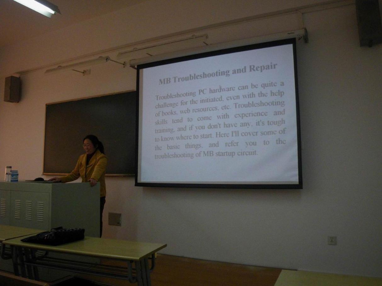 为有效推进全英语授课教学活动的进行,电子电气工程学院于4月8日13:00在教学楼B315,对下学期准备开设全英语课程的教师进行了业务培训。有着多年海外工作和学习经历的方易圆老师讲授了以“MB Troubleshooting and Repair”为主题的全英语示范课。方老师结合主板电路的组成和工作原理,流利地用英语讲述了主板问题的解决办法。方老师的45分钟示范课给了参加培训的教师很大启发,老师们均感到受益匪浅,并对英语授课的准备工作、教学效果、提高学生积极性和兴趣等问题进行了深入地探讨。