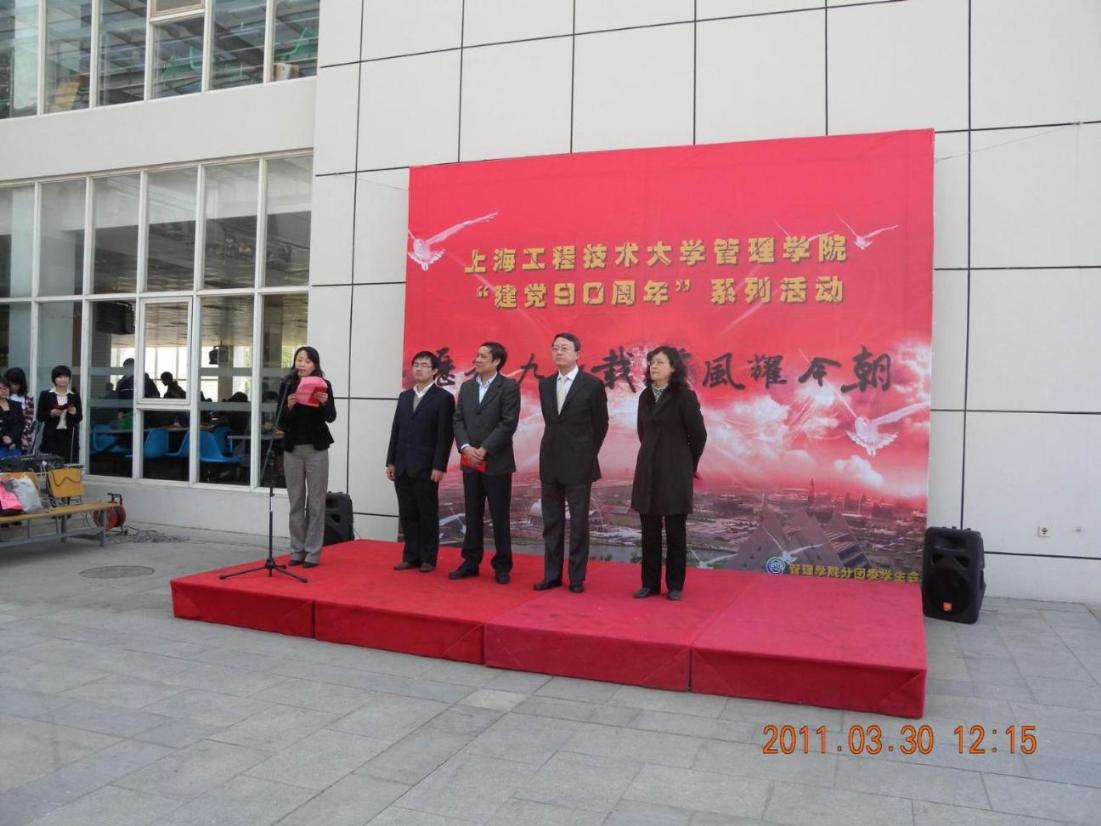 为庆祝建党90周年,促进我校学风建设,3月30日中午12:00,管理学院“建党九十周年”系列活动启动仪式在校大食堂隆重举行。副校长孙培雷,管理学院党委书记吴清,管理学院党委副书记虞蓉,学生处处长王明复,以及管理学院的学生参加了此次启动仪式。