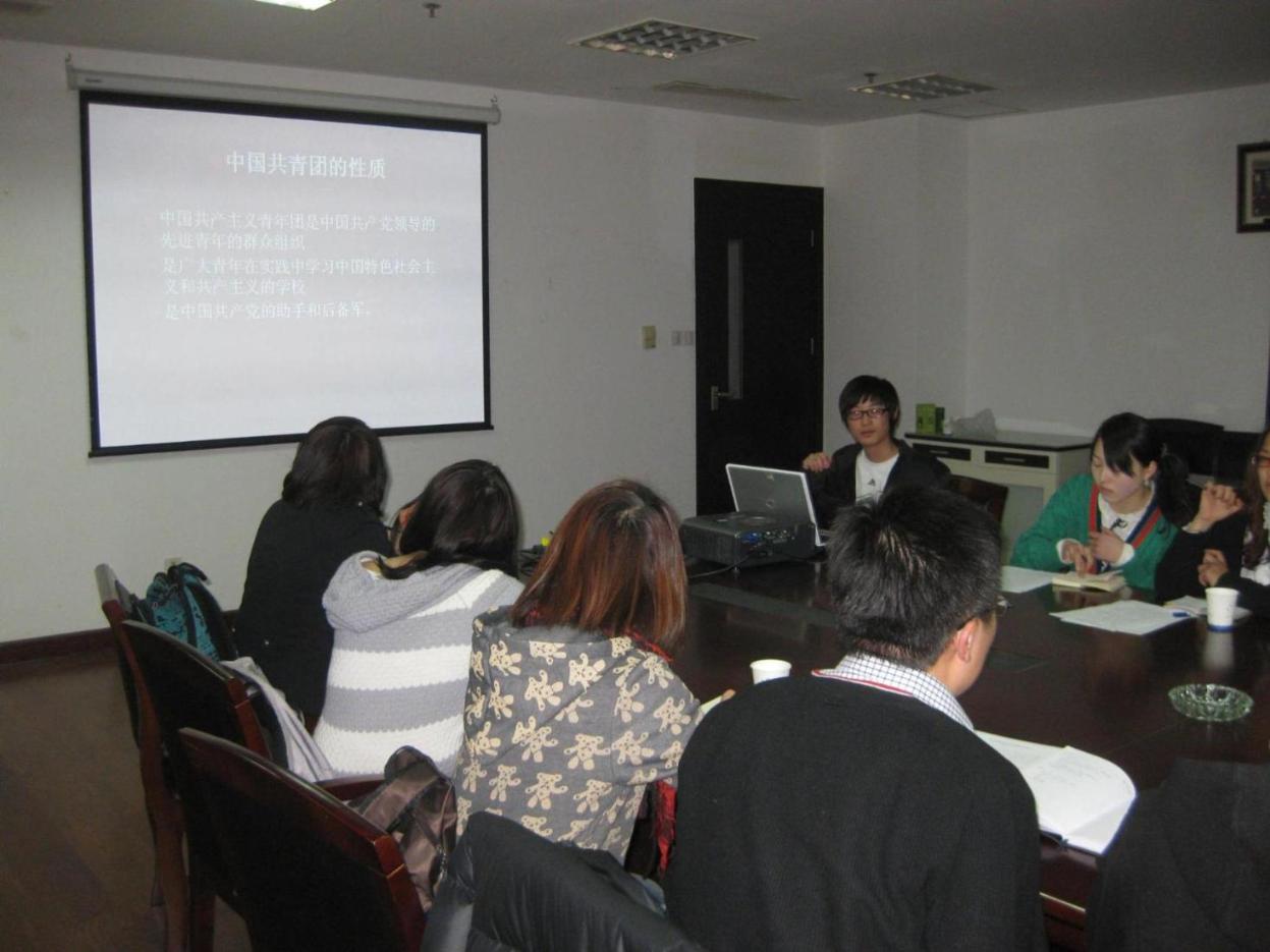 培训由10级团干王帆主讲。在培训中,与会成员首先回顾了中国共青团团史、基础团务知识、共青团所具有的优良传统和作风,继而针对如何争做一名优秀共青团员作了进一步讨论。培训结束后,大家纷纷表示在今后的学习工作中,一定严格要求自己,认认真真学习,踏踏实实做事,积极地为更好地促进学风建设、创建学习型团组织而努力奋斗。