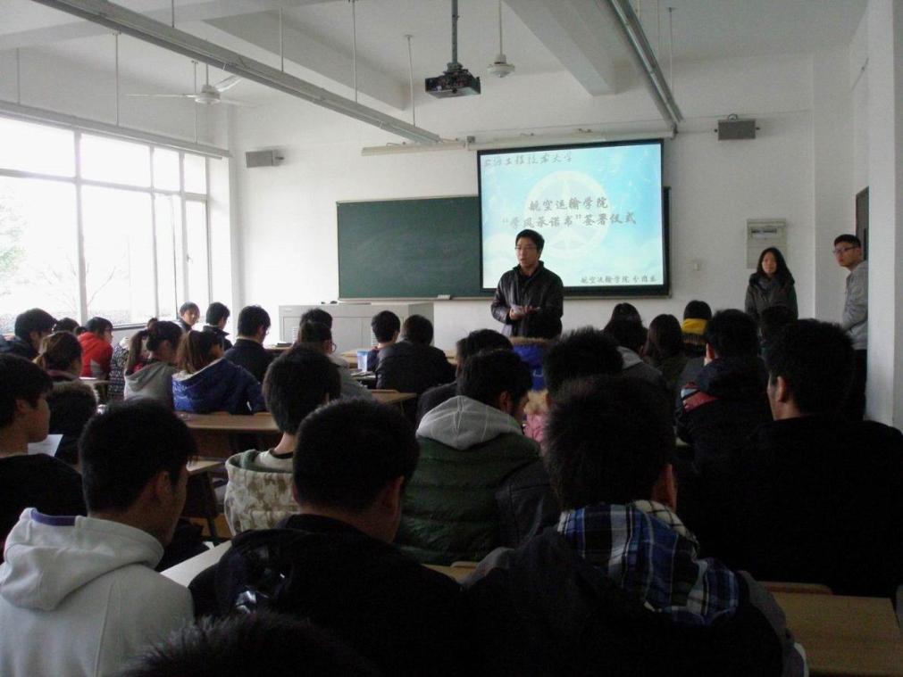 3月16日12:30,由航空运输·飞行学院组织部、自律会主办的“学风承诺书”签署仪式在教学楼D110举行。航院分团委书记林小希老师、副书记周凯、组织部部长卫思涛和自律会部长苏晓燕来到活动现场参与活动。各班的班长、团支书及飞行专业的部分同学参加了此次签署活动。