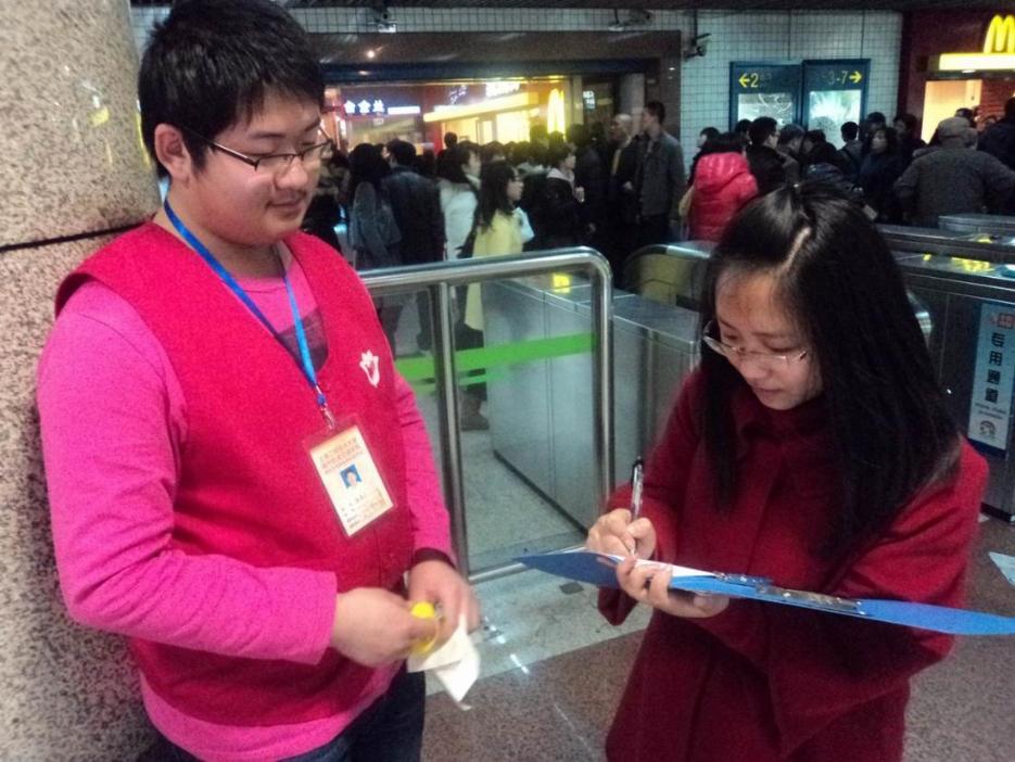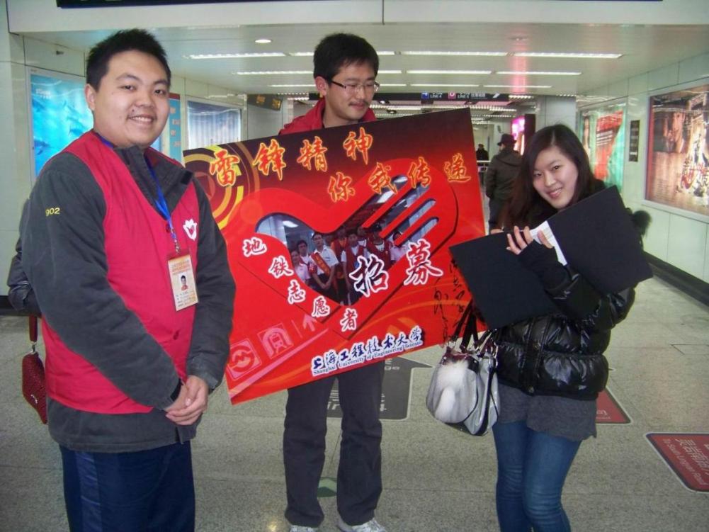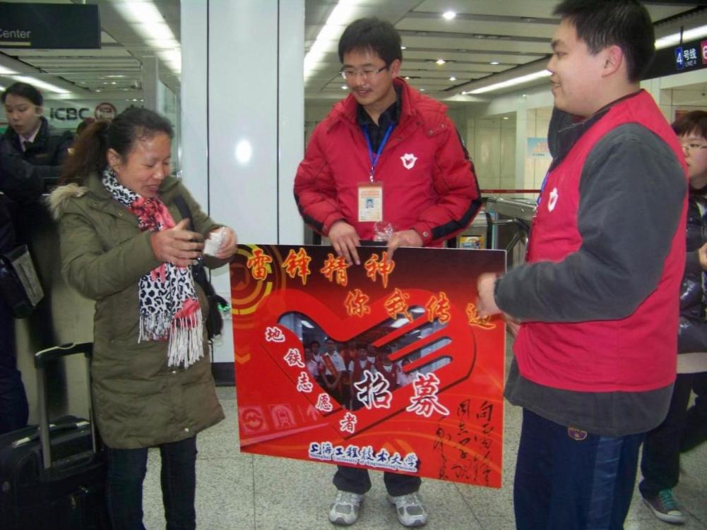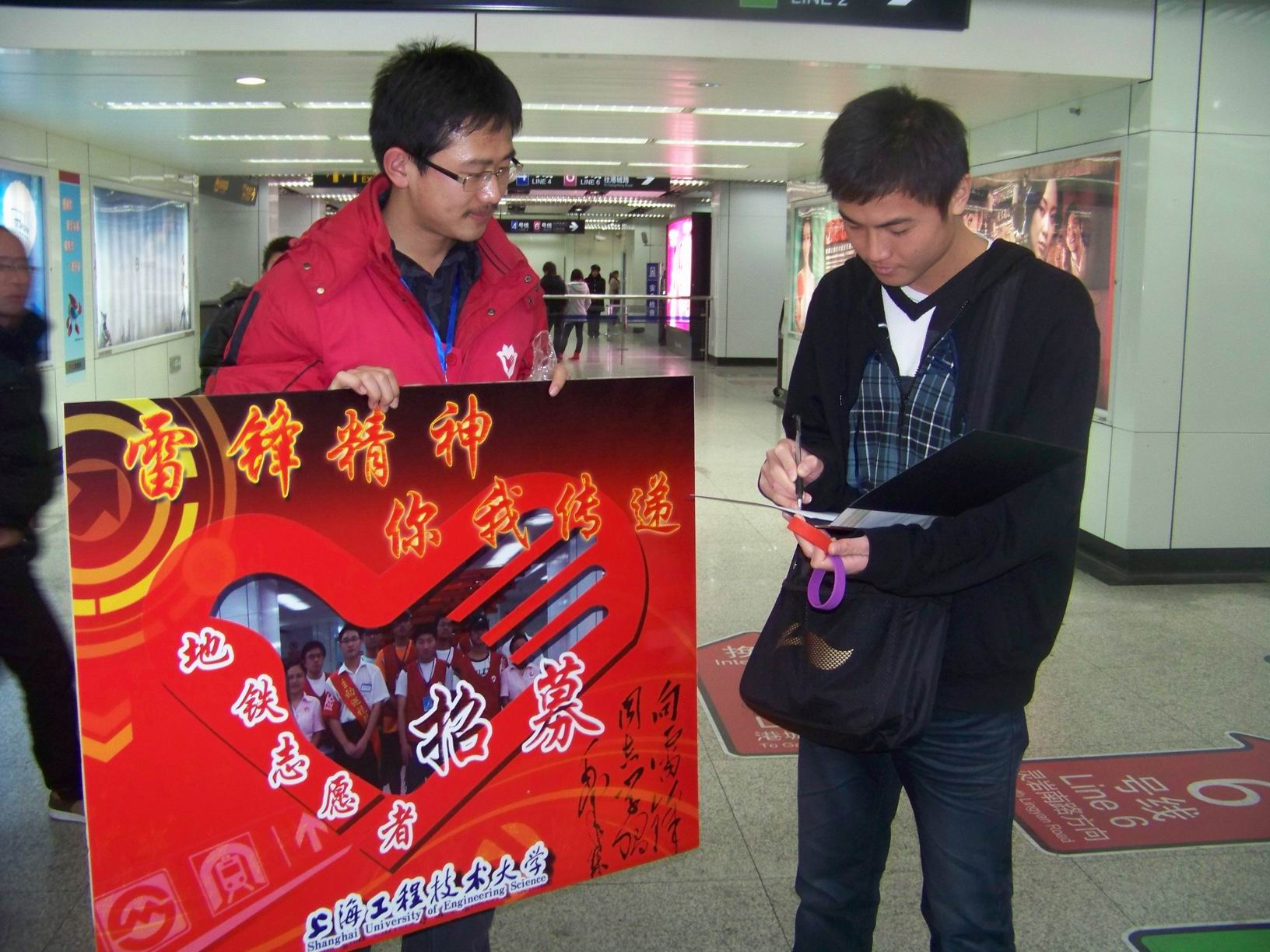 3月5日,在上海地铁2号线的各个车站里,城市轨道交通学院的党团员青年向过往乘客招募地铁志愿者,用这种特殊方式传递着新时代的雷锋精神。