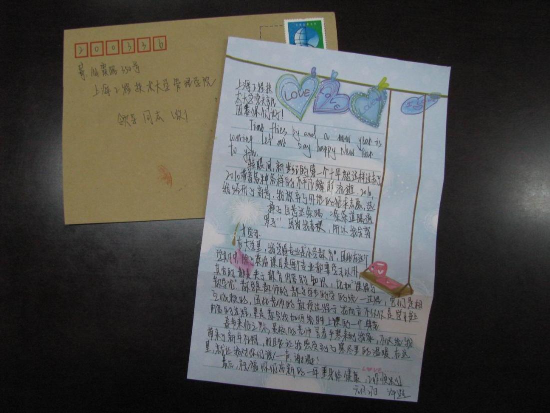 陈女士丈夫因车祸早逝,她本人身患癌症,还有一个读高中的女儿,因此生活非常拮据。在与陈女士一家结成帮困对子的七年多来,管理学院志愿者们不仅定期上门慰问,还与她的女儿许遐结成对子,每月来给她补习功课,终于在2010年如愿考入大学,学习“小学教育”专业。在信中,许遐向管理学院老师们谈了2010年对她的重要性以及在大学里的学习感悟,同时,她代表全家也感谢了管理学院老师和同学们对她们家庭一如既往的关怀和帮助。