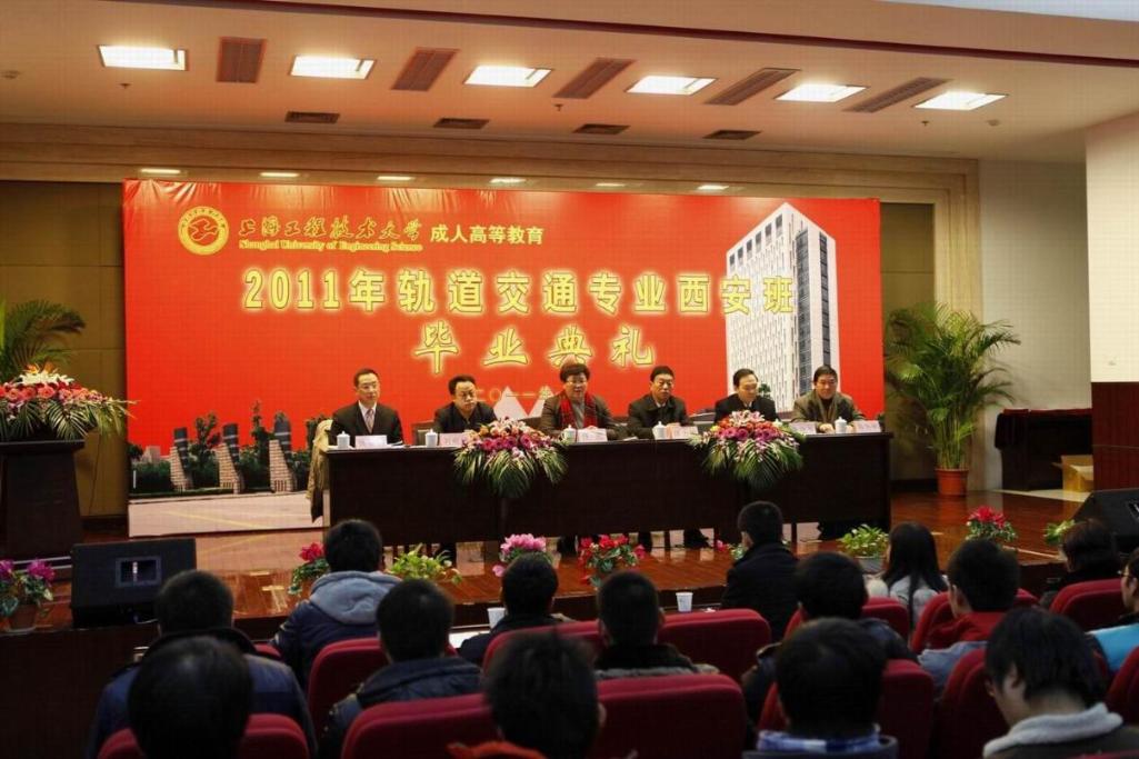 1月13日,上海工程技术大学成人高等教育2011年轨道交通专业西安班毕业典礼在松江校区图文信息中心第二报告厅隆重举行。汪泓校长、陈力华副校长出席此次典礼,继续教育学院、城市轨道交通学院的领导、上海地铁公司培训中心的领导、西安地铁运营公司经理刘峻峰等代表参加了毕业典礼。