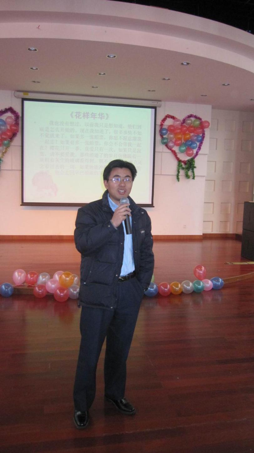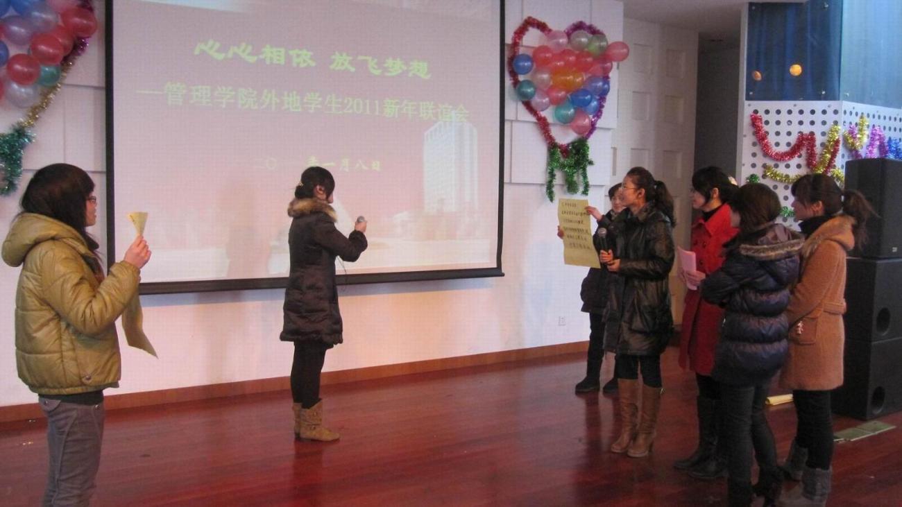 1月8日下午1:30,管理学院“心心相依,放飞梦想”外地学生2011新年联谊会在师生活动中心三楼多功能厅拉开序幕。管理学院党委书记吴清老师,党委副书记虞蓉老师,副院长胡斌、邱玲老师,学院辅导员老师以及08、09、10级外省市同学参加了此次联谊会。