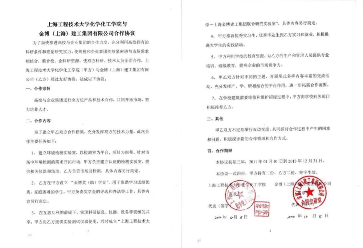 与金博(上海)建工集团的合作是化学化工学院积极开拓企业资源、探索创新教育形式,所签订的重要的企联合项目,合作内容涉及科研、教学、合作教育、就业、奖(助)学金设立等多个方面,其势必在未来的几年里,为学院发展和学生培养提供有利的保障。