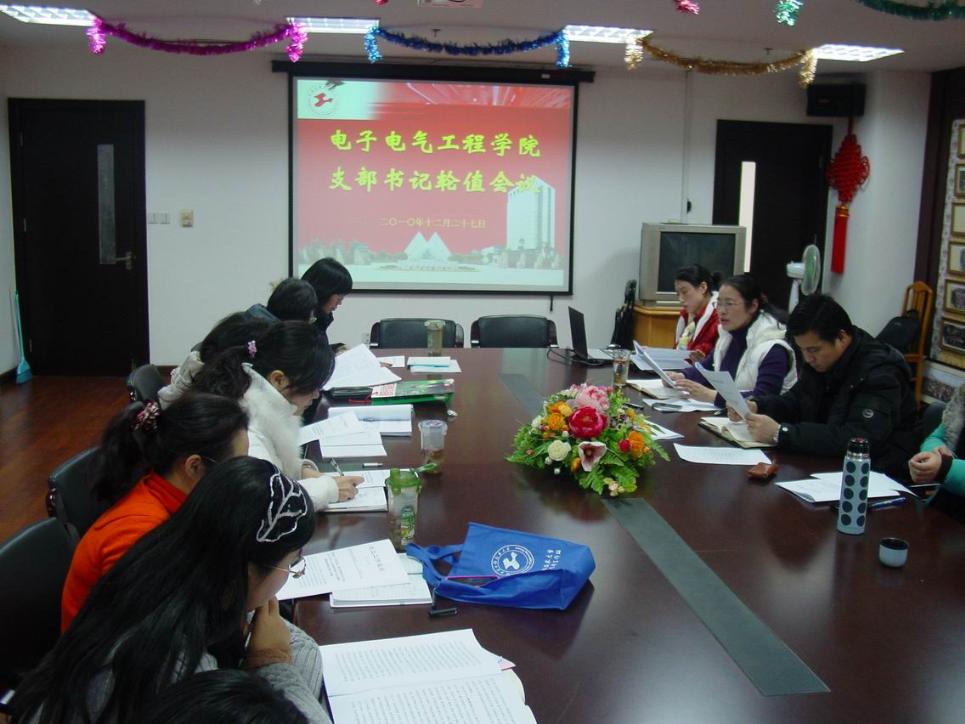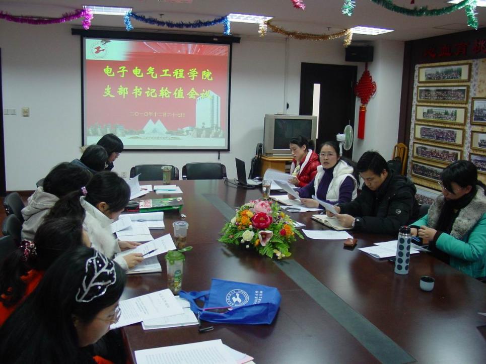 12月27日下午15:00,电子电气工程学院在行政楼912会议室召开支部书记轮值会议。会议由党委书记茅蕾主持,全体支部书记参加了此次会议。 首先,由轮值书记刘惠彬老师向大家展示了计算中心党支部所开展的活动,总结了工作上的经验与不足,各支部书记针对其工作的开展进行了交流学习。